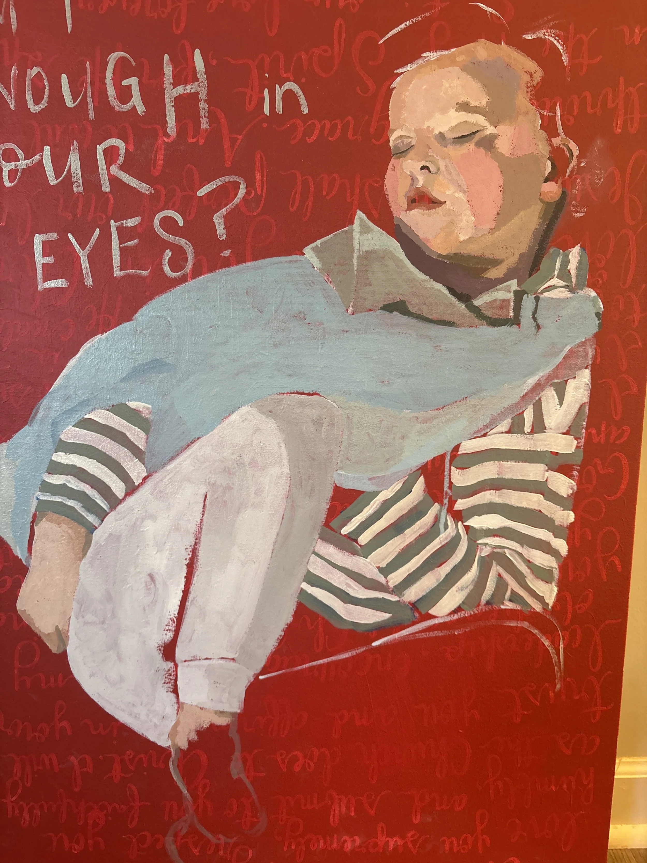 It’s no wonder my experience of motherhood is a massive part of my art practice. I can’t stop drawing and painting these children. In the least cliché way, they are my world. Not because I need them to please me or fulfill me, but because I must spend every waking, and sometimes sleeping, moment considering them and their needs. And that makes me different. It attaches me. I will not know a truly carefree moment again. The individual and the mother that are both sides of me are everyday warring. I am restrained. And I cannot stop thinking about the meaning of this. I cannot stop thinking of the value of this. And I’m going to keep working it out on canvases until I understand more of who I’ve become in relation to the beings my body created.